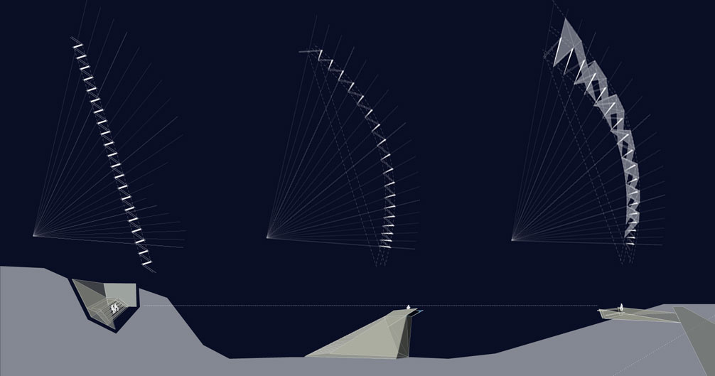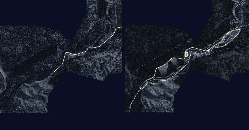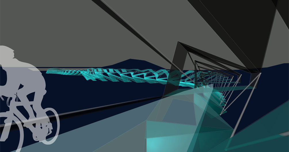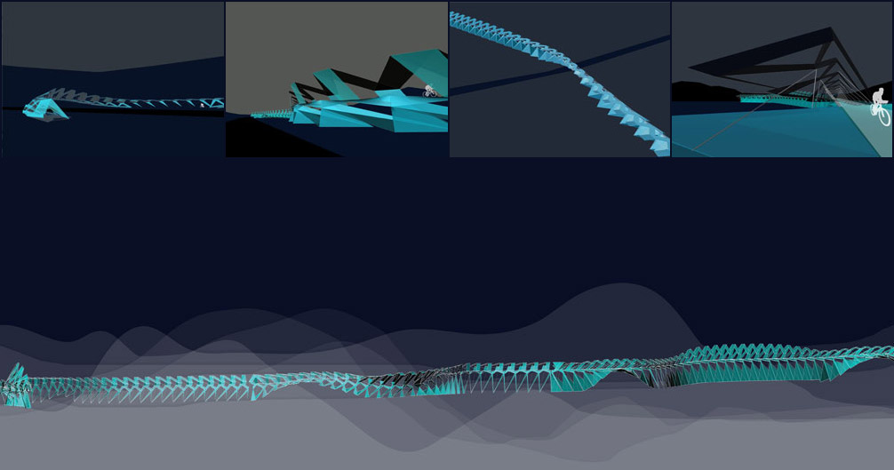 Situated along the traces of the former Great California Cycleway , the project employs such techniques to create a distorted continuity in a landscape once divided.
